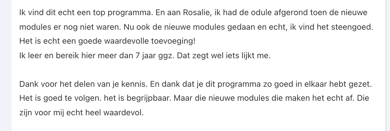 Het mooie is dat je dus niet elke dag hoeft in te loggen. Het belangrijkste is dat je de inzichten en praktische oefeningen die je leert, toepast in je dagelijks leven. Dat is waar de echte verandering plaatsvindt. De tijd die je online besteedt is minder belangrijk dan de tijd die je besteedt aan het toepassen van wat je hebt geleerd.