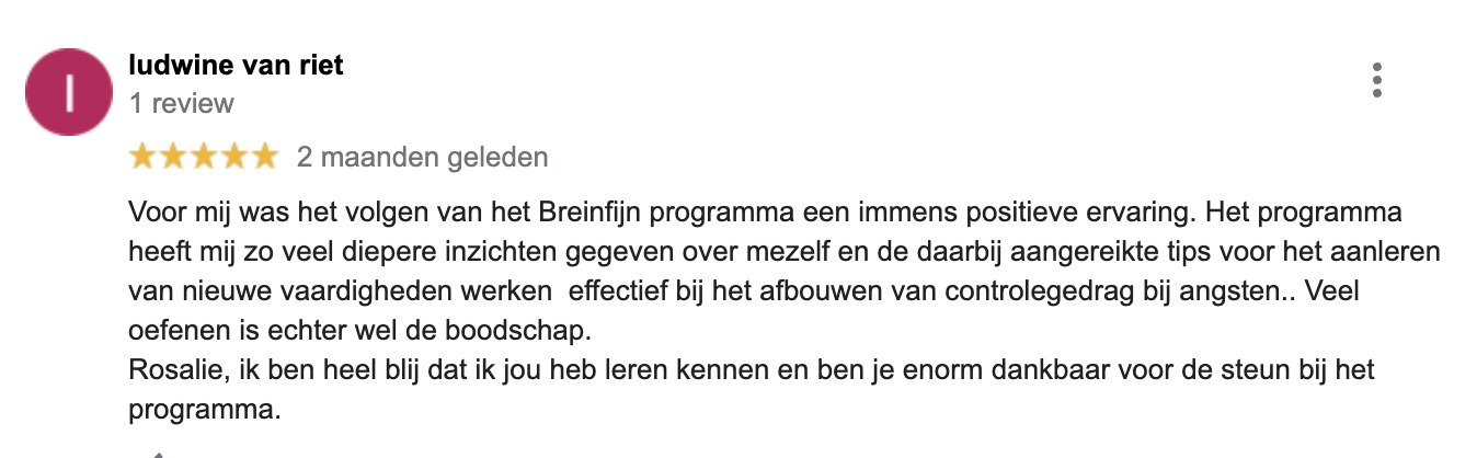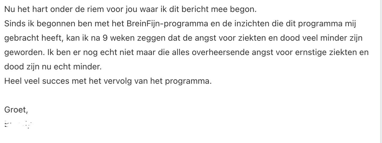 Dit programma biedt tools die aansluiten bij jouw specifieke situatie. Daarnaast is er de mogelijkheid tot persoonlijke begeleiding waarbij je vragen kunt stellen en dieper kunt ingaan op jouw persoonlijke uitdagingen. Dit alles maakt het Breinfijn programma een ideale keuze voor iedereen die bereid is te investeren in een blijvend kalmer en meer gebalanceerd leven.