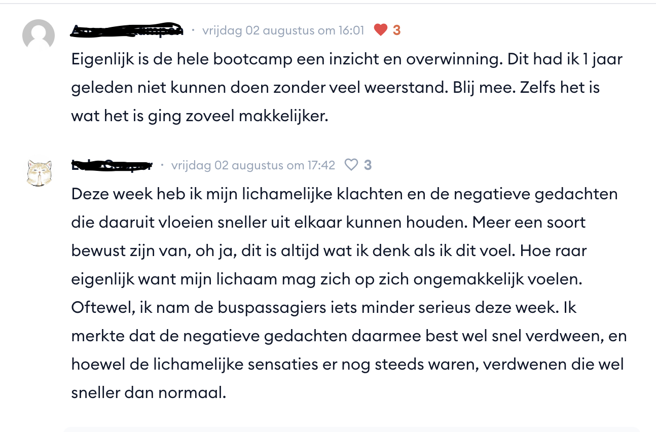 Dankzij de korte oefeningen heb ik eindelijk het idee dat ik stappen maak. Ik had al 12 sessies gehad bij een psycholoog, maar ik merkte geen vooruitgang. Voor mij is de kracht juist de manier waarop je gaat oefenen. Juist niet als ik stress heb. Ik merk nu dat dat mijn grootste valkuil was, want ik was gewoon hele dag in overleefstand. Nu weet ik dat ik ook niet open stond om te leren.